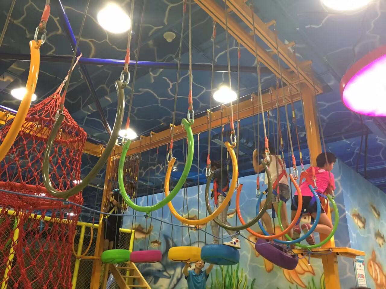 儿童拓展探索乐园是由多个不同结构的平台组合而成,每个平台由金属支撑杆、环扣、拉力绳索等部件经严密科学设计,连接成为独立的攀爬、跨越、行走步道;各平台通过合理的搭配组合,则使攀爬、跨越及空中行走变得更加复杂多变,增加挑战性和趣味性。根据步道的攀爬、行走难易程度,步道设置分为青少年组和儿童组,可视经营者需求、场所环境、面积等自由组合,进行个性化定制。本套设备是无动力游乐设备,拆装灵活方便。可根据场所环境对设备进行颜色搭配创意。此项目可满足专业的儿童素质教育训练来使用。也为那些在激烈竞争、身心过度透支和高速节奏生活中的成年人来为孩子营造一个品尝“欢乐”与“挑战”的空间,帮助每个儿童留住儿时的天真和欢乐。